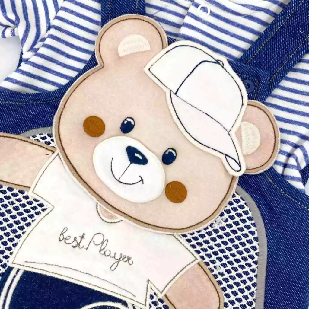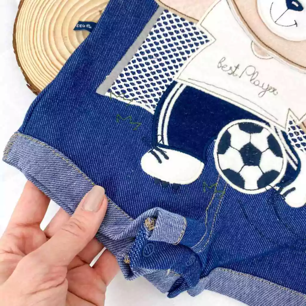 Macacão Curto Jeans e Malha Sharpey Ursinho Jogador de Futebol